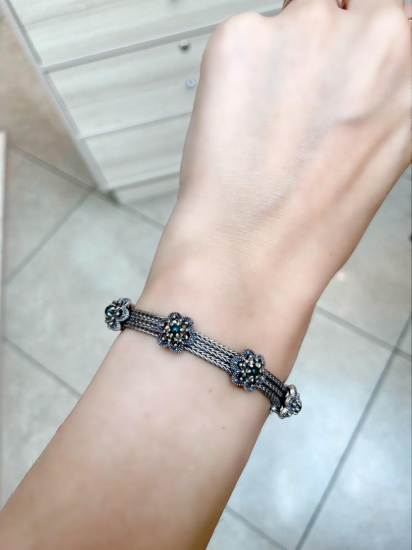 Ürün 925 Ayar Gümüştür.Bileklik Uzunluğu 18 cm'dir.Uzun süre rengini koruması için her türlü kimyasal ile temasından kaçınılmalıdır.