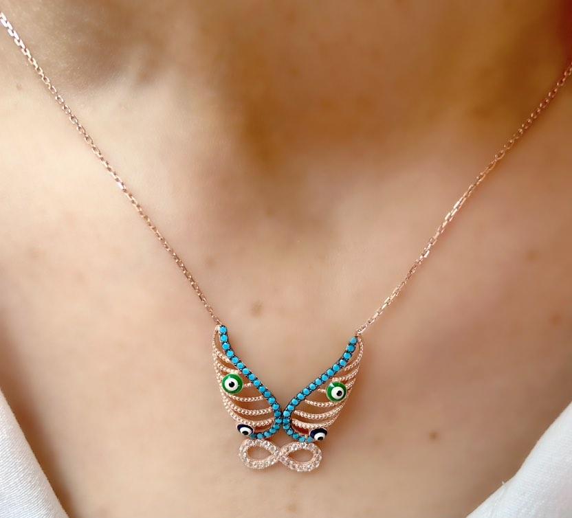 Turkuaz Taşlı Ve Mineli Kelebek Kolye